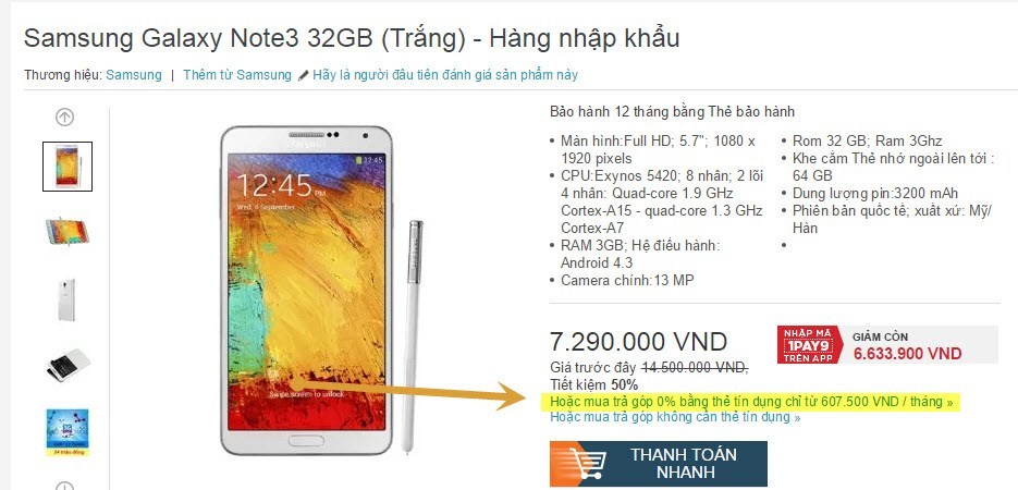 Sản phẩm bạn chọn mua phải có giá trên 3tr, các sản phẩm được cho thanh toán trả góp điều có ghi chú, bạn có thể xem điều này trong sản phẩm như hình dưới đây…