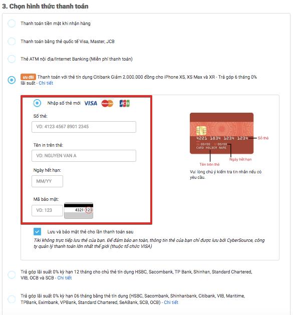 Tiếp theo bạn sẽ lựa chọn hình thức thanh toán. Đối với hình thức trả góp 0% lãi suất bạn có 3 hình thức để lựa chọn. Xem chi tiết hình dưới: